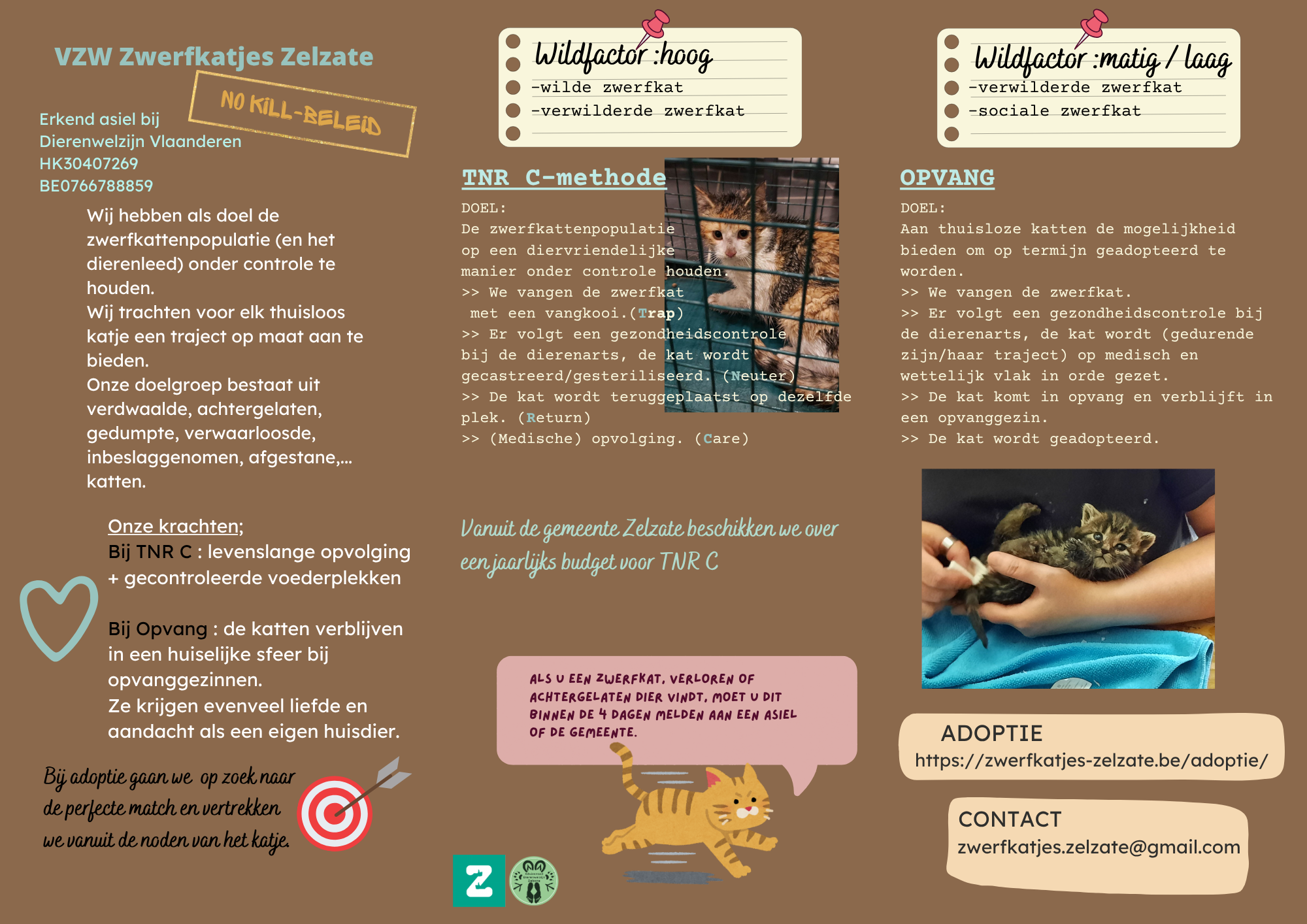 Vzw Zwerfkatjes Zelzate heeft als doel de zwerfkattenpopulatie te verminderen door hen steriel te maken en van opvang te voorzien in de hoop de katjes een echte thuis te kunnen bezorgen.